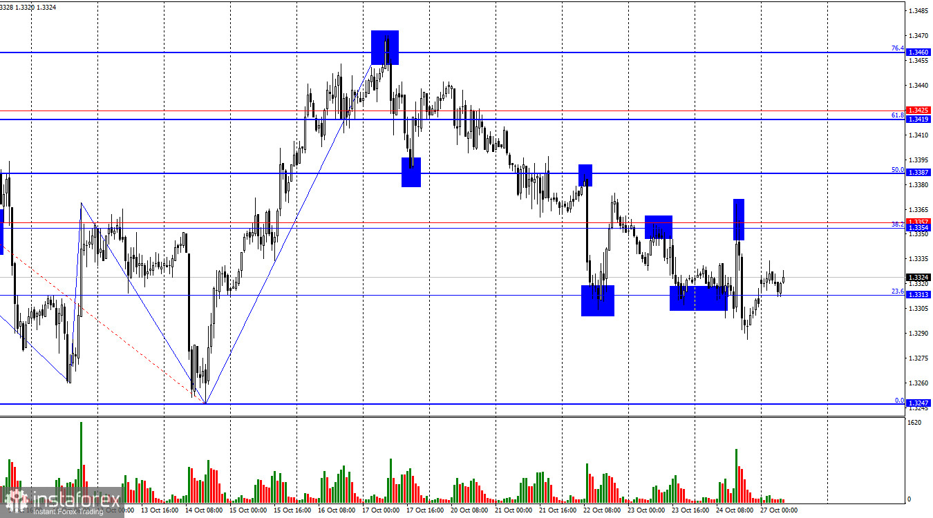 Pe graficul orar, perechea GBP/USD a înregistrat vineri o creștere bruscă spre nivelul de rezistență de 1.3354–1.3357, urmată de o scădere, o inversare în favoarea dolarului american și o scădere la fel de accentuată. Astăzi, o revenire de la nivelul Fibonacci de 23,6% la 1.3313 sugerează o posibilă nouă mișcare ascendentă spre nivelul de 1.3354–1.3357. O consolidare a perechii sub 1.3313 ar favoriza dolarul și ar semnala o continuare a scăderii spre următorul nivel corectiv de 0.0% – 1.3247.