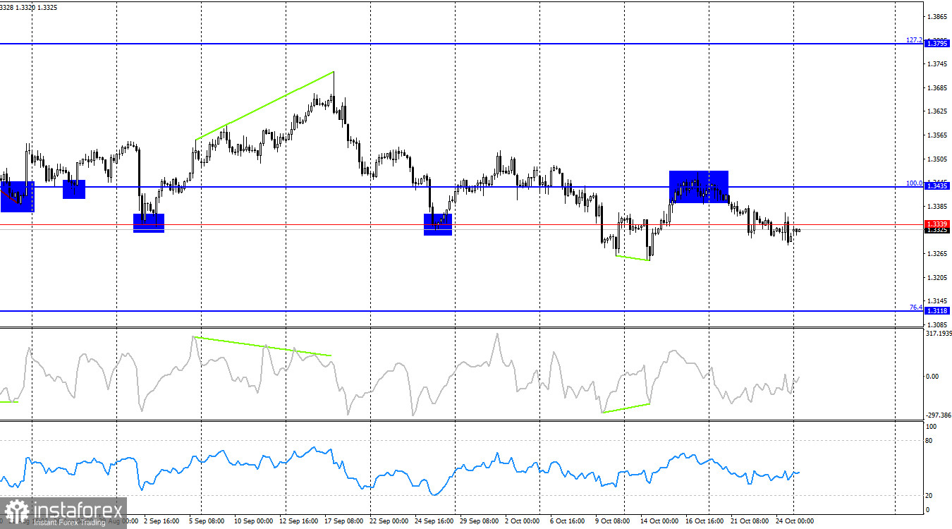 Pe graficul de 4 ore, perechea s-a întors în favoarea lirei după formarea unei divergențe bullish pe indicatorul CCI, crescând apoi până la nivelul corectiv de 100,0% la 1,3435. Un recul de la acest nivel a favorizat moneda americană, conducând la o scădere către 1,3339, unde perechea se tranzacționează de peste o săptămână. Nu se observă noi divergențe emergente pe niciun indicator. Deocamdată, ar trebui acordată mai multă atenție graficului orar pentru analiză.