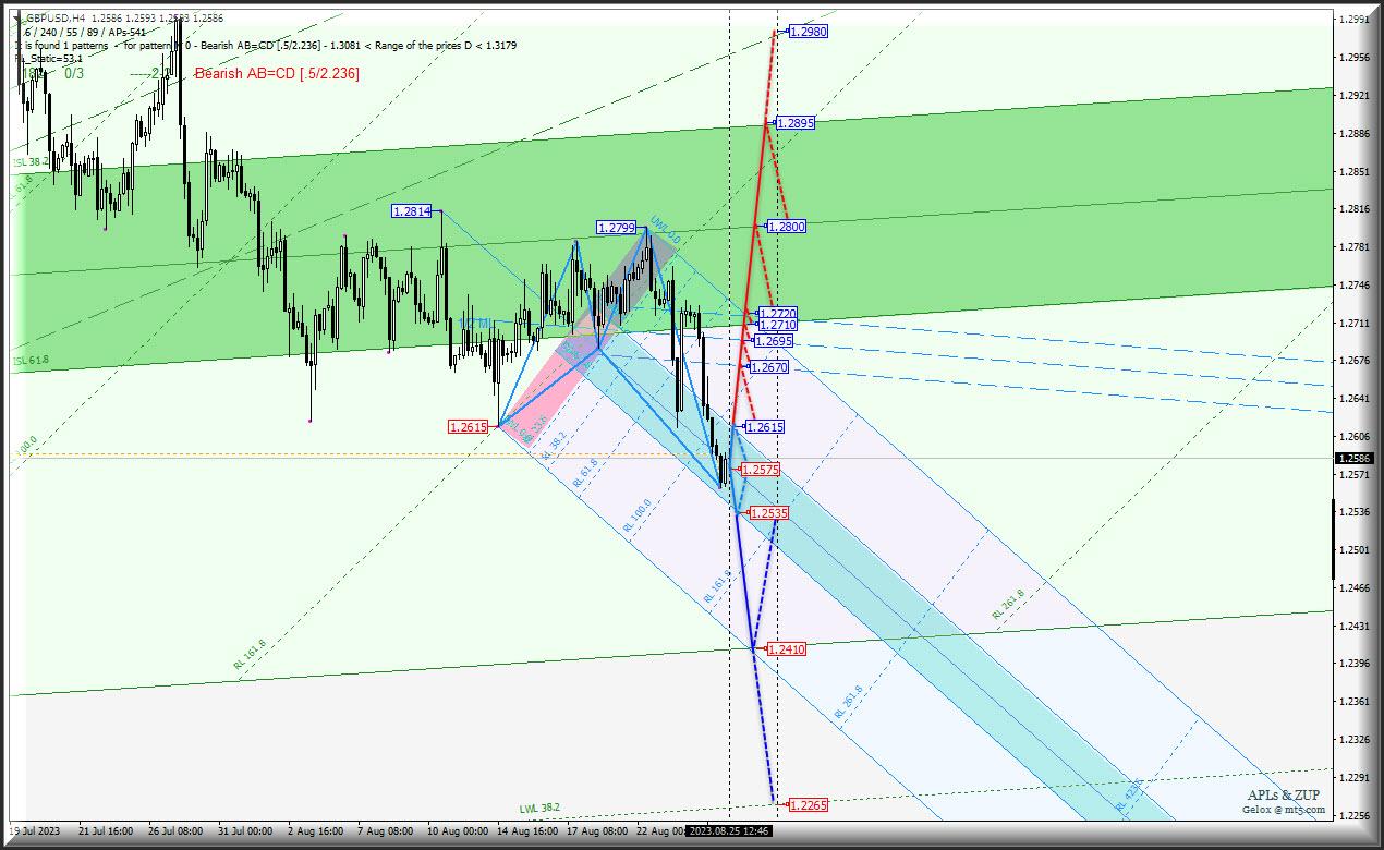 Валюта Его Величества - GBP/USD-h4 - с 28 августа 2023 г. станет развивать движение исходя из отработки и направления пробоя границ зоны равновесия (1.2615 - 1.2575 - 1.2535) нисходящих вил младшего операционного масштаба Minuette-h1.