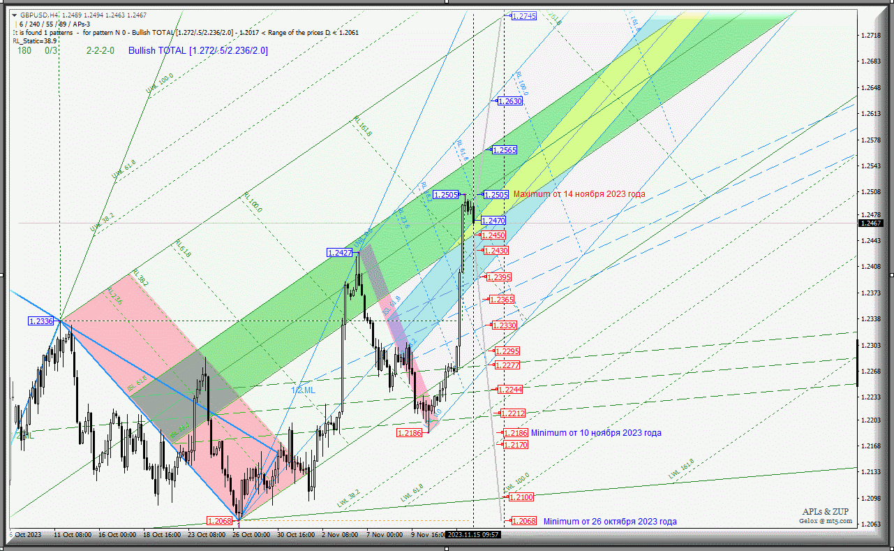 А далее - движение валюты Его Величества - GBP/USD-h4 - с 15 ноября 2023 г. продолжится в границах зон равновесия вил операционных масштабов - Minuette-h1 (1.2395 - 1.2430 - 1.2470) и Minute-h4 (1.2450 - 1.2505 - 1.2565), а направление этого движения будет обусловлено направлением пробоя диапазона: