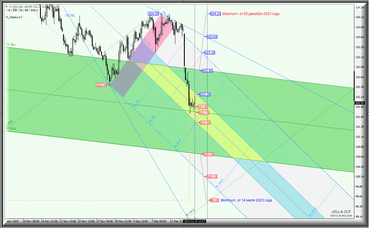 Индекса доллара - #USDX-h4 c 18 декабря 2023 г. продолжит развитие своего движения в зоне равновесия (102.80 - 101.75 - 100.70) вил старшего операционного масштаба Minute-h4 в соответствии с отработкой и направлением пробоя границ зоны равновесия (102.20 - 101.90 - 101.50) вил младшего операционного масштаба Minuette-h1 и срединной линии Median Line Minute-h4 (101.75).