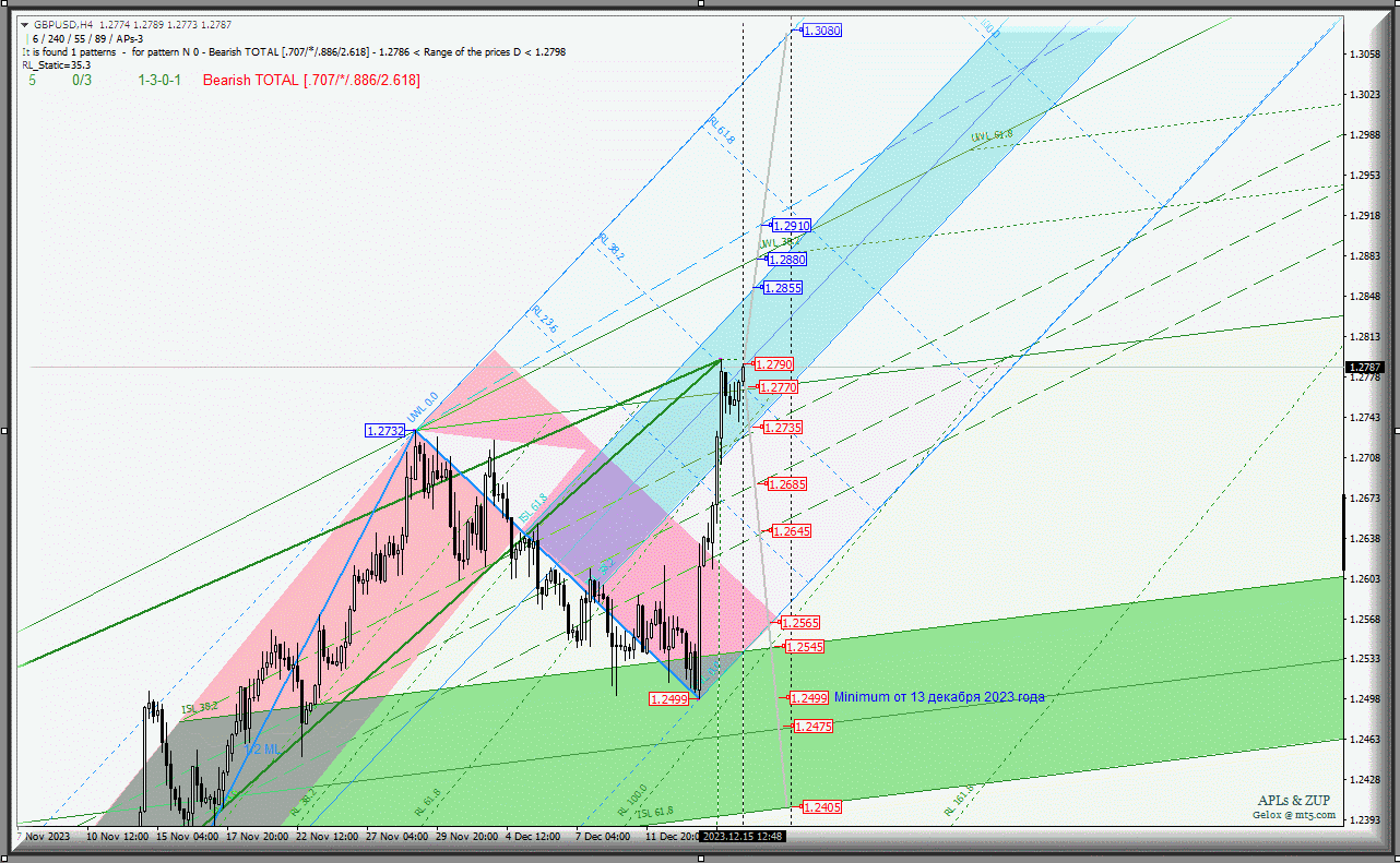 Движение валюты Его Величества - GBP/USD-h4 c 18 декабря 2023 г. станет определяться отработкой и направлением пробоя границ зоны равновесия (1.2855 - 1.2790 - 1.2735) вил младшего операционного масштаба Minuette-h1, а так же будет зависеть от варианта отработки паттерна Гартли.