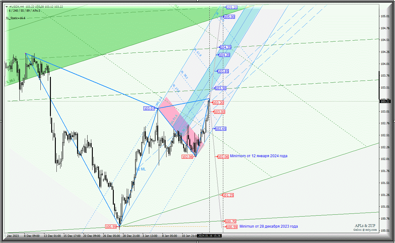 Индекс доллара - #USDX-h4 с 17 января 2024 года станет развивать свое движение исходя из отработки и направления пробоя границ канала 1/2 Median Line (103.00 - 103.20 - 103.50) восходящих вил младшего операционного масштаба Minuette-h1.